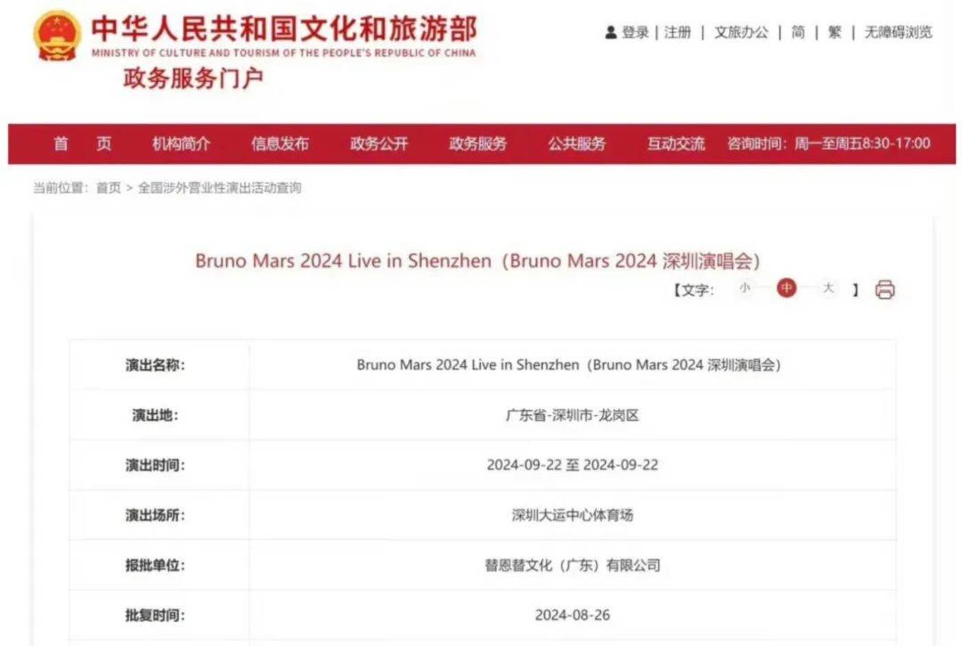 比如,深圳就将于 9 月和 11 月接连迎来两位国际歌手的惊喜空降。火星哥 Bruno Mars 造访深圳必定是个重磅新闻,微博近期流出的截图来自文旅部官方批复,基本是坐实了他将于 9 月 22 日在深圳大运中心体育场热力开唱。
