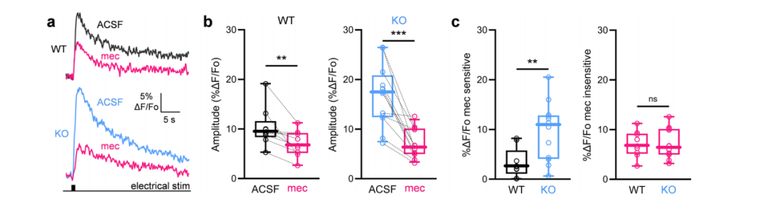 研究发现,虽然此类小鼠的基础 5-HT 释放能力并未改变,但由于 CINs 密度和活性更高,导致电刺激诱发的 5-HT 信号中美加明敏感成分 (即依赖乙酰胆碱的部分) 显著增强。