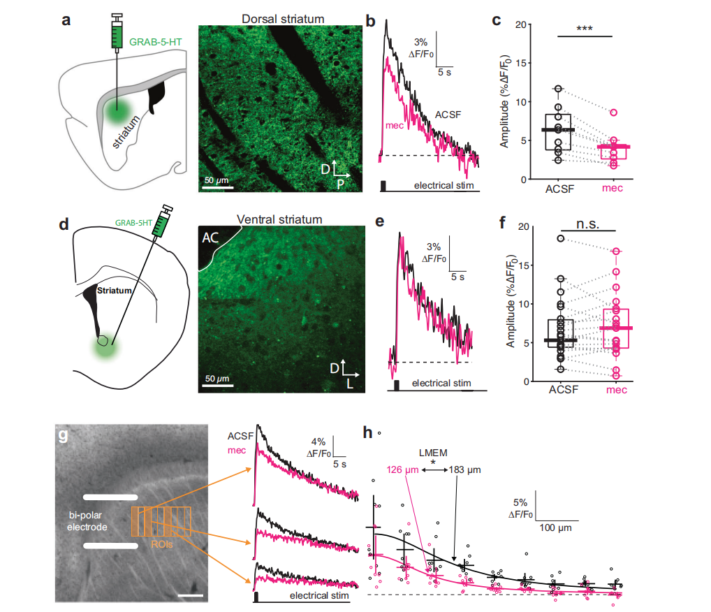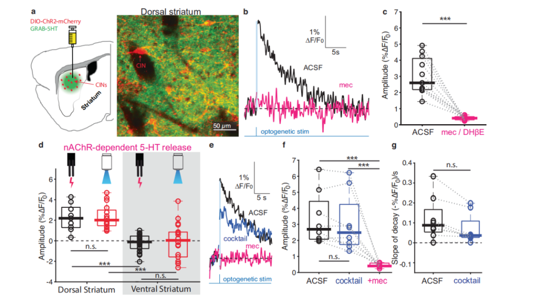 研究团队利用双光子成像与 GRAB-5HT 传感器,在急性脑切片中观察到背侧纹状体内的电刺激能诱发显著的 5-HT 释放,且这种释放高度依赖于 nAChRs 的激活。