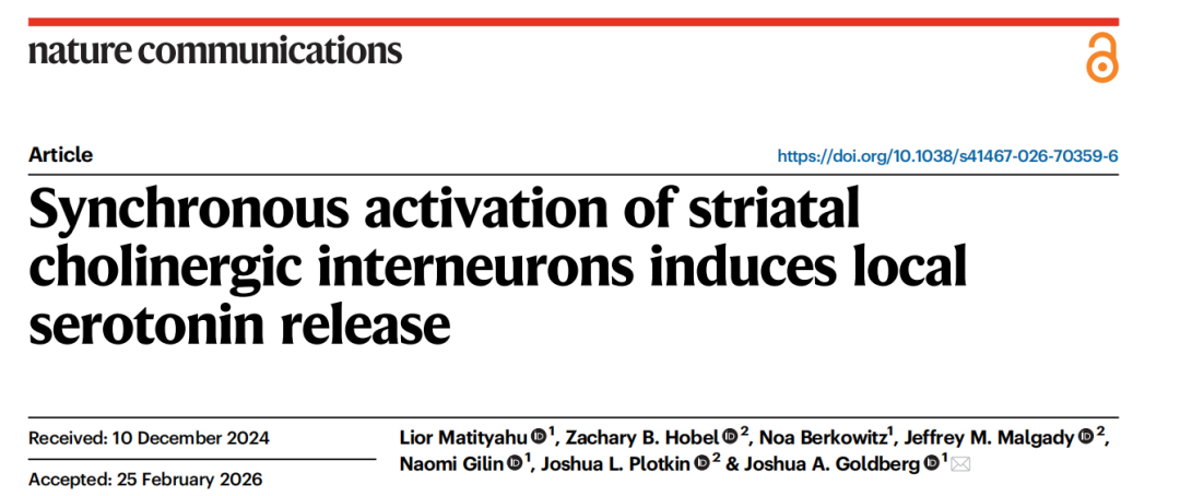 基于此,2026 年 3 月 16 日,希伯来大学 Joshua A. Goldberg 研究团队在 《Nature communications》杂志发表了“Synchronous activation of striatal cholinergic interneurons induces local serotonin release” 揭示了纹状体胆碱能中间神经元的同步激活诱导局部 5-羟色胺释放。