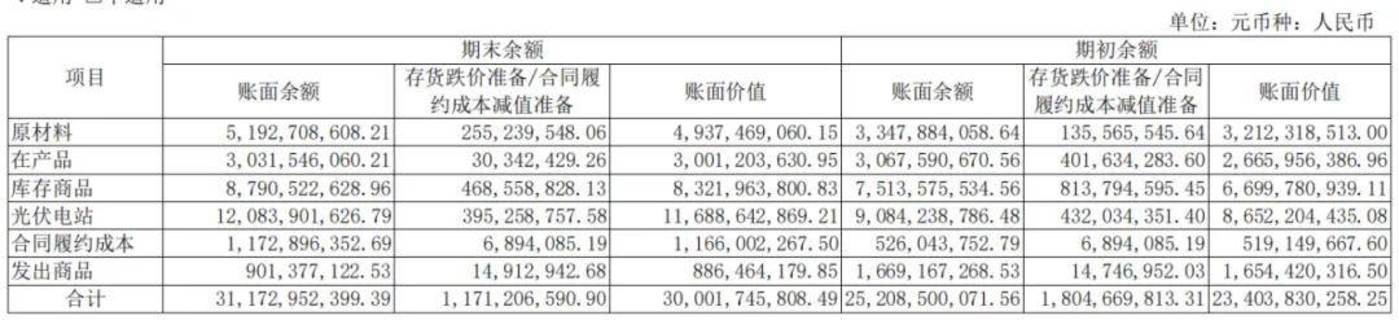 其中光伏电站、库存商品、原材料是公司存货主要构成。截至 2024 年 6 月 30 日,该三类账面余额分别为 120.84 亿元、87.91 亿元 51.93 亿元。