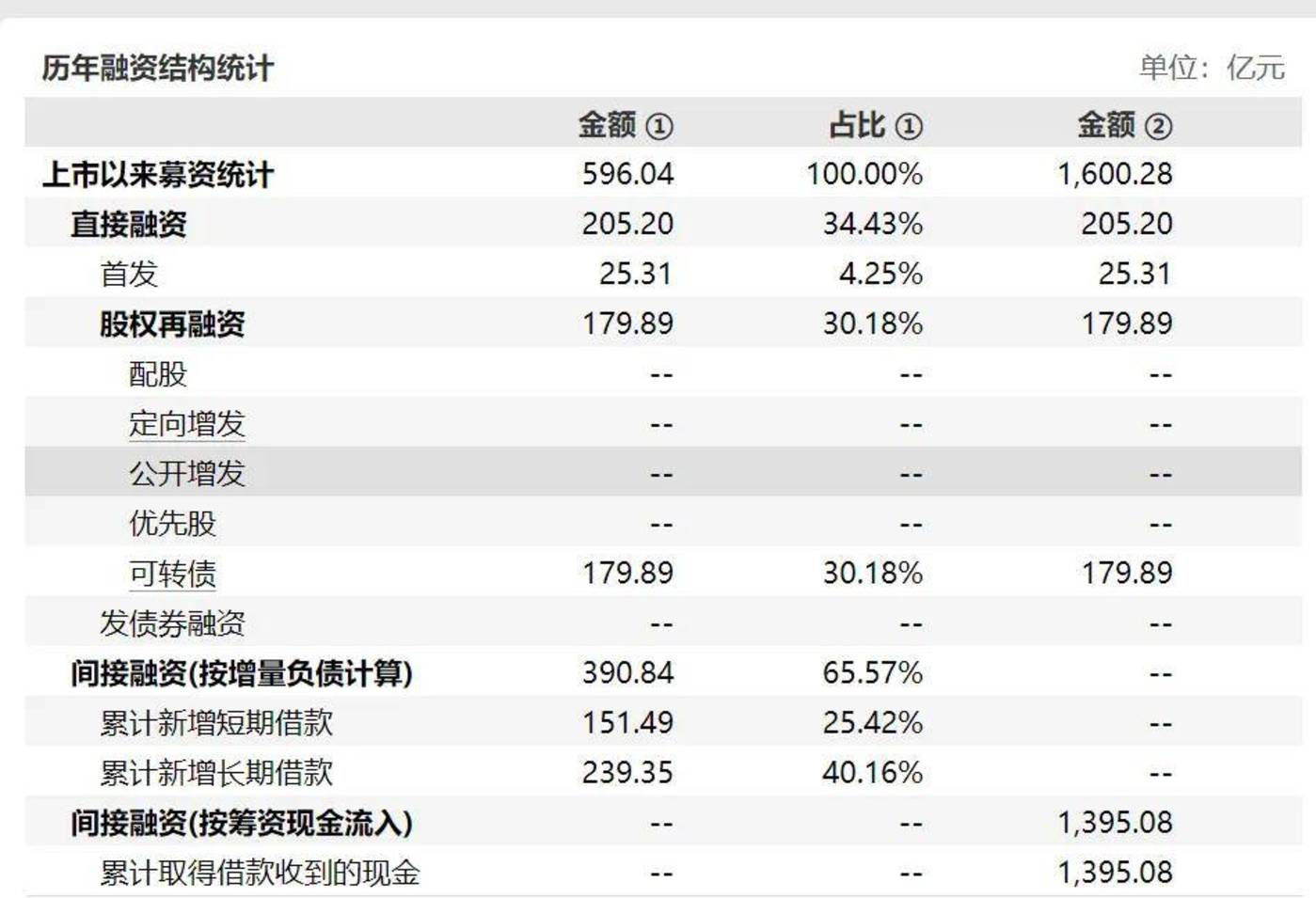 Wind 数据显示,自上市以来,天合光能募资金额为 596 亿元,其中在资本市场通过 IPO 及发行可转债融资金额为 205.2 亿元,向银行等金融机构间接融资金额为 390.84 亿元。