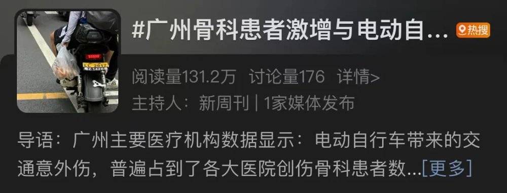 上个月,一则 「广州骨科患者激增与电动自行车有关」 的话题登上微博热搜。广州自 2021 年 11 月在政策层面为电动自行车上路行驶解套松绑,却带来了 「电车越多,骨科越旺」 的后果。