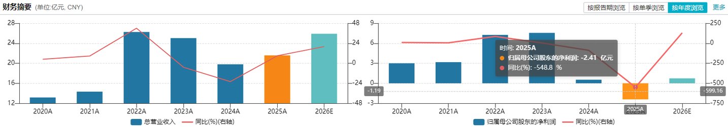 但利润端出现断崖式下滑,归母净利润从 2024 年盈利 5372.63 万元转为亏损 2.41 亿元;2022 年与 2023 年,公司分别盈利 7.26 亿元、7.56 亿元,2025 年加权平均净资产收益率降至-6.96%,盈利能力大幅削弱。