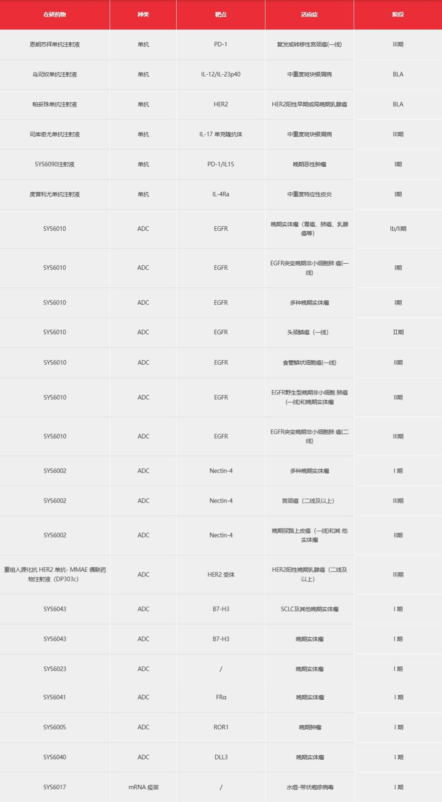 这笔巨额投入主要用于公司抗体药物、ADC(抗体偶联药物)、mRNA 疫苗三大前沿平台的管线推进,包括注射用奥马珠单抗 (恩益坦®) 新适应症获批上市,SYS6010(EGFR 突变晚期非小细胞肺癌二线)、SYS6002(宫颈癌二线及以上) 两款 ADC 产品进入 III 期临床,帕妥珠单抗注射液、乌司奴单抗注射液递交 BLA(生物制品许可申请),9 款产品获得中国临床试验批准、4 款斩获美国 FDA 临床批件。