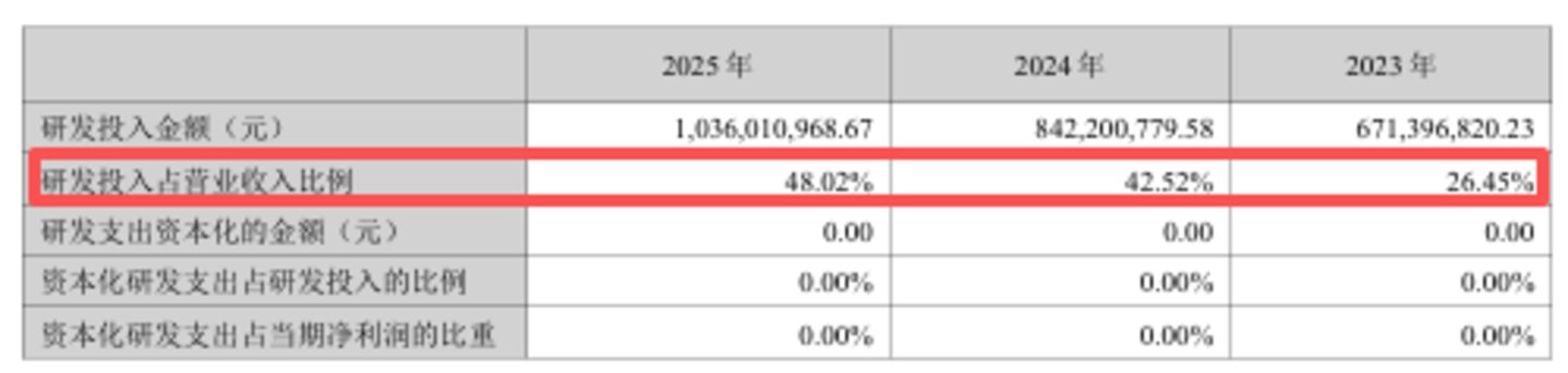 2025 年公司研发投入高达 10.36 亿元,同比增加 1.94 亿元,增幅达 23%,研发投入占营业收入的比例高达 48.02%,远超行业平均水平。