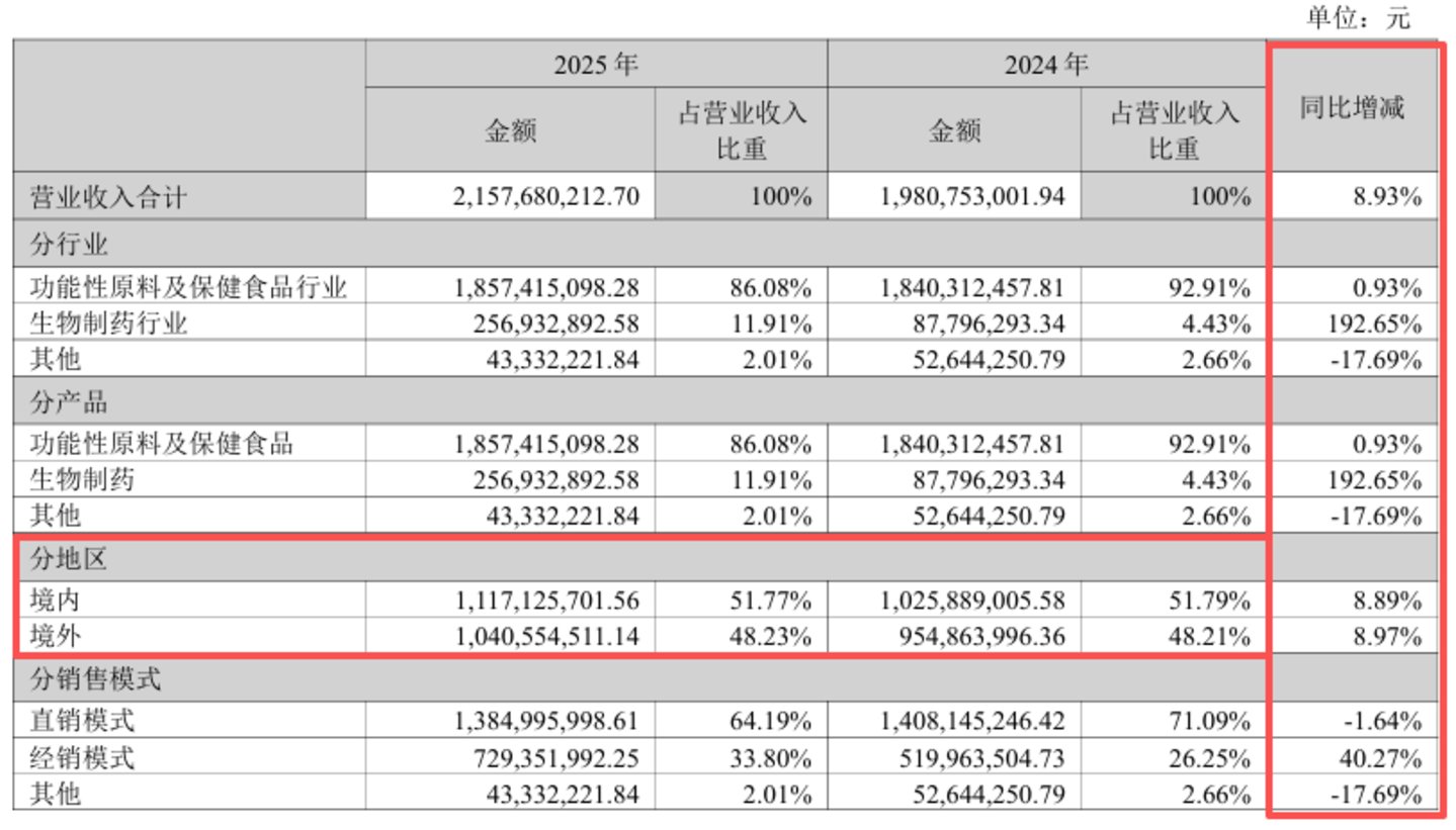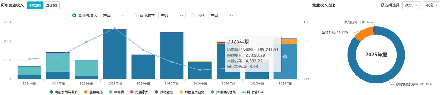 2025 年功能性原料及保健食品收入占总营收的 86.08%,仍是公司绝对的收入支柱,但 0.93% 的同比增速、11.39% 的毛利额下滑,暴露了传统业务的增长瓶颈。