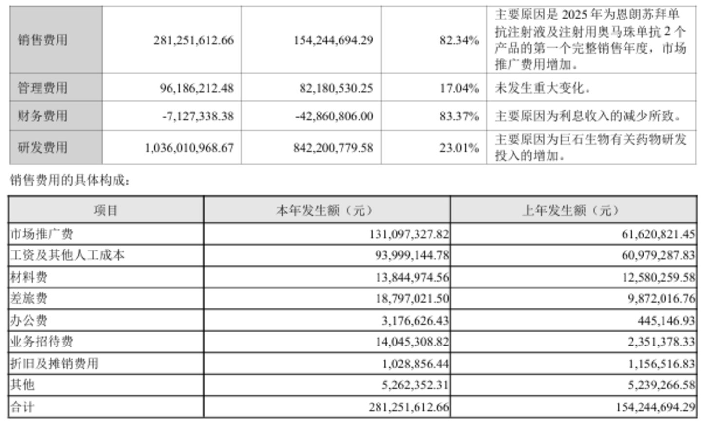 与此同时,生物制药业务进入首个完整商业化年度,恩朗苏拜单抗注射液、注射用奥马珠单抗两款新药的市场推广带动销售费用大幅增长,2025 年销售费用达 2.81 亿元,同比激增 82.34%,其中市场推广费、差旅费、药物找招待费均翻倍增长,成为利润端的另一大压力项。