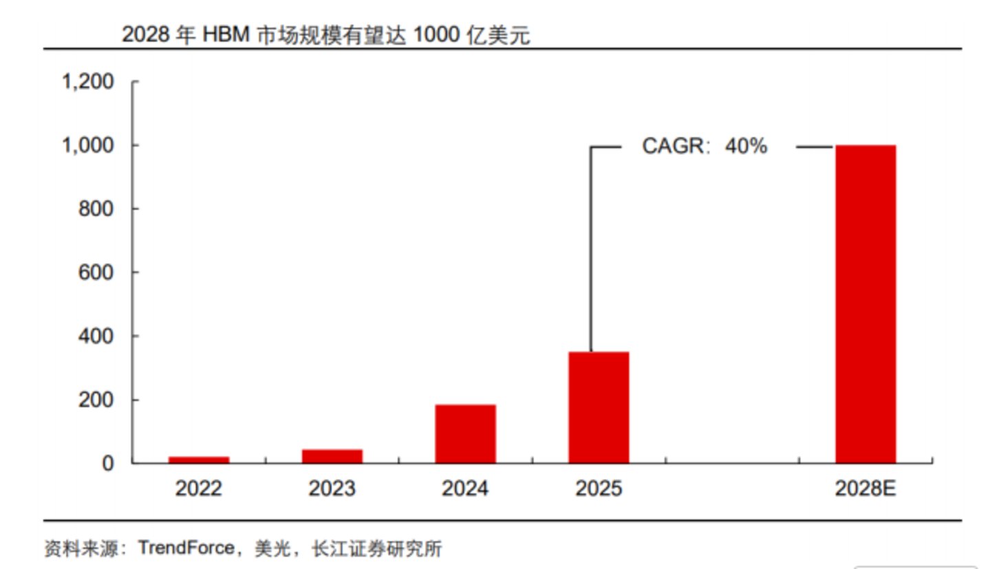 HBM 是与 GPU、ASIC 直接封装的存储芯片,随着 GPU 与 ASIC 产品迭代及需求高速增长,其市场规模也在快速扩张。根据美光预测,2028 年 HBM 市场规模有望达到 1000 亿美元,2025—2028 年期间复合增速高达 40%。