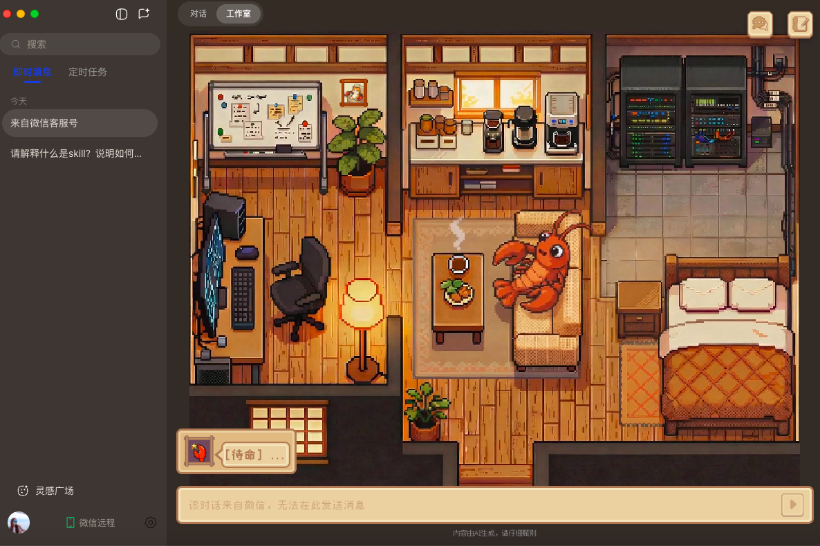 在此次 V0.1.9 更新中,QClaw 引入了一个极具温度的 UI 设计——“ 龙虾工作室” 。这是一间像素风的温馨小屋,用户可以直观地看到龙虾在里面敲键盘、看白板 。