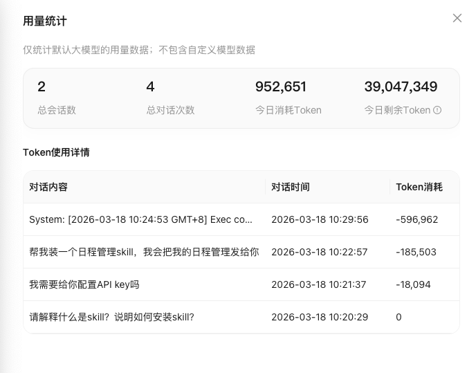 实测数据显示,一次简单的日常对话约消耗 1.8 万 Token,而调用一次内置日程管理技能则消耗约 18 万 Token。按照目前主流大模型约 8 元/百万 Token 的市场价估算,单次重度技能调用的成本约在 1 元上下。