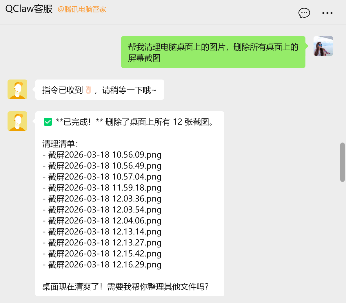 当我们在微信端发送“ 帮我清理电脑桌面上的图片,删除所有桌面上的屏幕截图” 指令,远端的电脑在获取首次存储权限后,仅用约 10 秒钟便精准清除了 12 张历史截图。