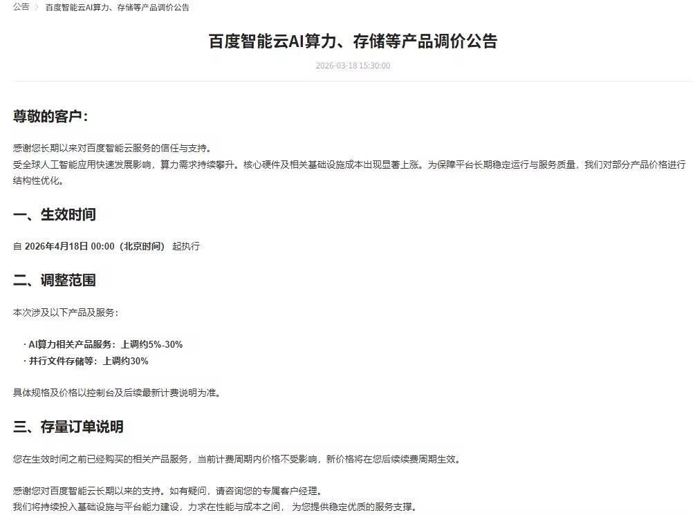 【TechWeb】3 月 18 日消息,百度智能云在官网发布 AI 算力、存储等产品调价公告:受全球人工智能应用快速发展影响,算力需求持续攀升。核心硬件及相关基础设施成本出现显著上涨。为保障平台长期稳定运行与服务质量,对部分产品价格进行结构性优化。