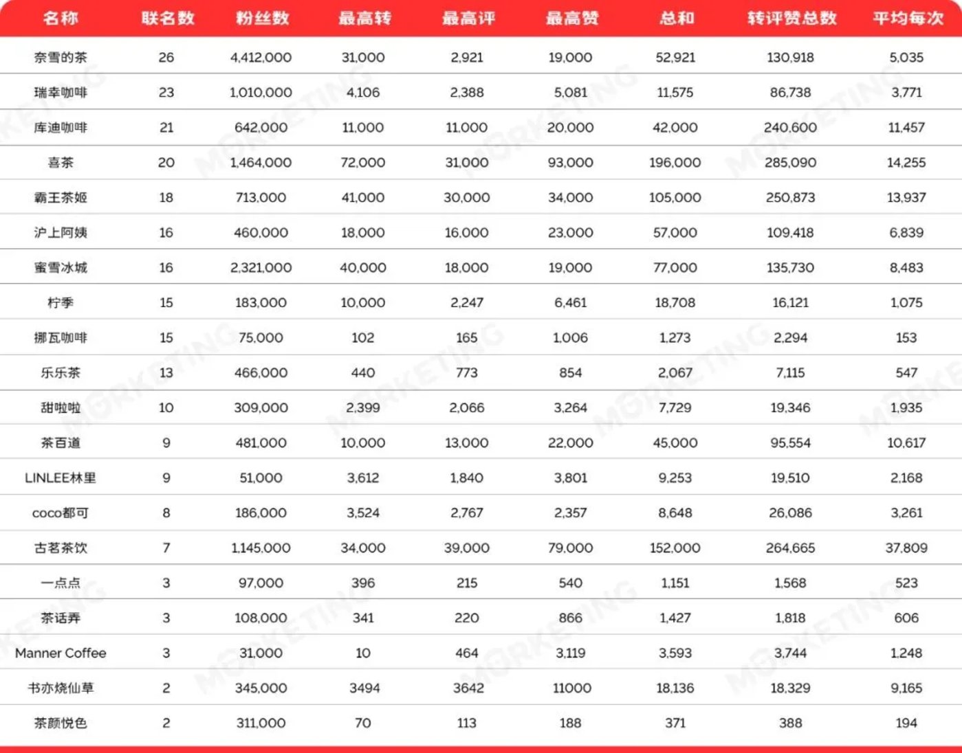 咖啡茶饮品牌今年上半年联名数据 (图源 Morketing)