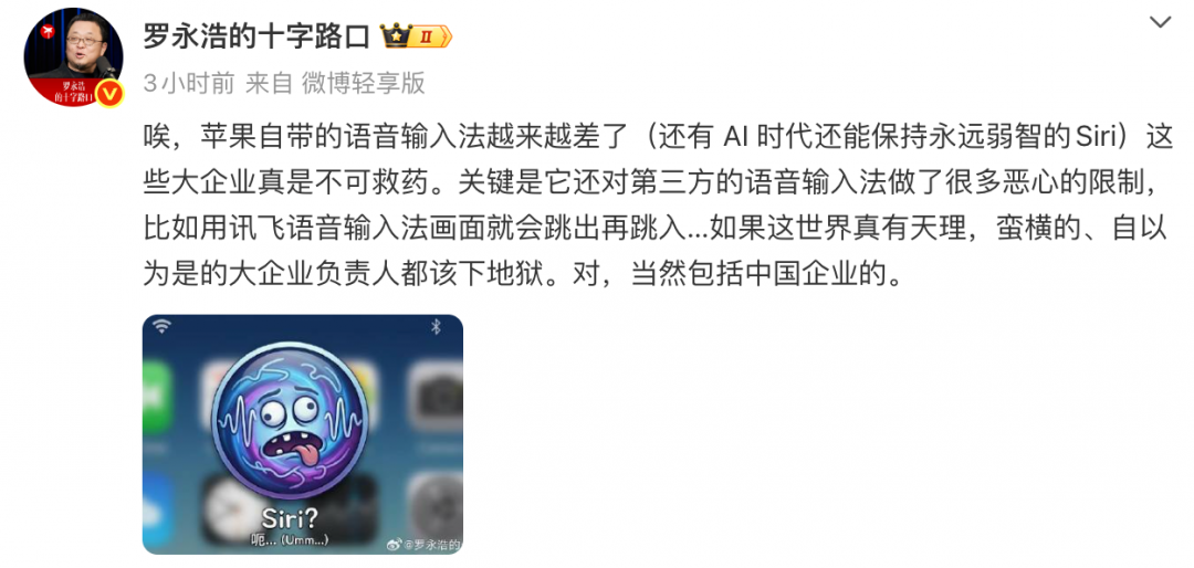 【TechWeb】3 月 20 日消息,今日,罗永浩在微博吐槽苹果公司的产品体验,他直言,苹果自带语的音输入法体验越来越差,就连在 AI 时代的 Siri,也依旧 「永远弱智」,直言这类大企业 「不可救药」。