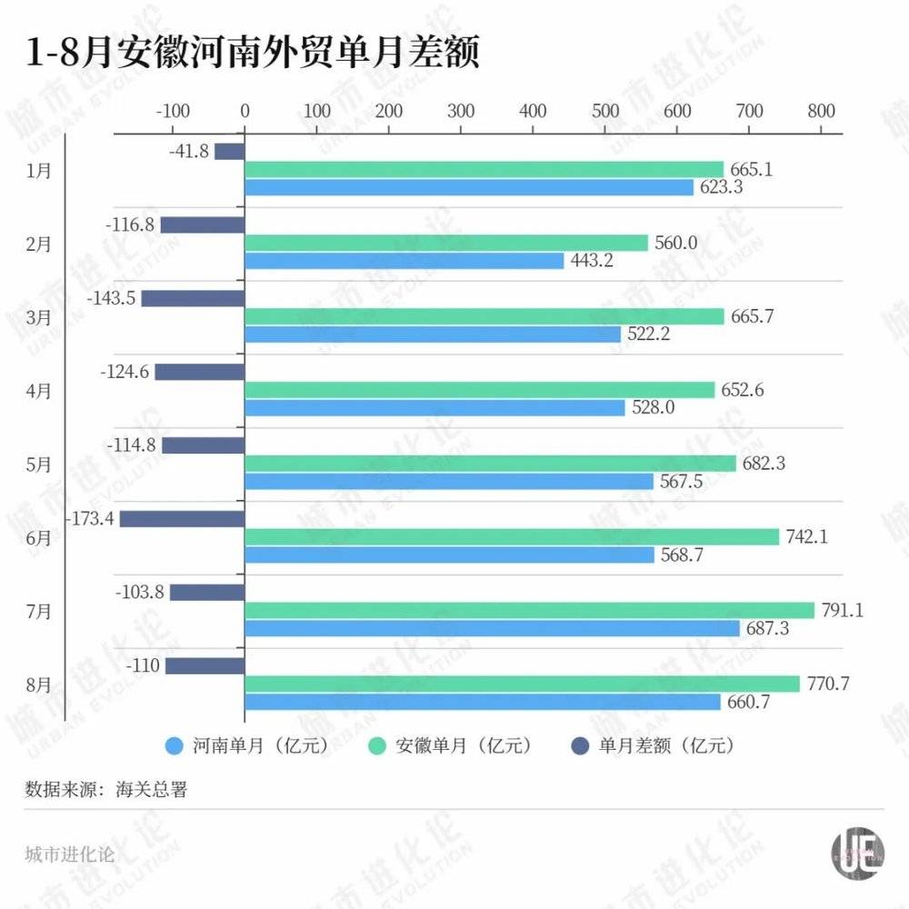 具体到单月,安徽外贸额几乎每个月都比河南高出 100 多亿元,最多是在 6 月份,差额达到 173.4 亿元。不过河南也释放出积极信号,7 月份和 8 月份,已经比前半年的单月差额有所减小。