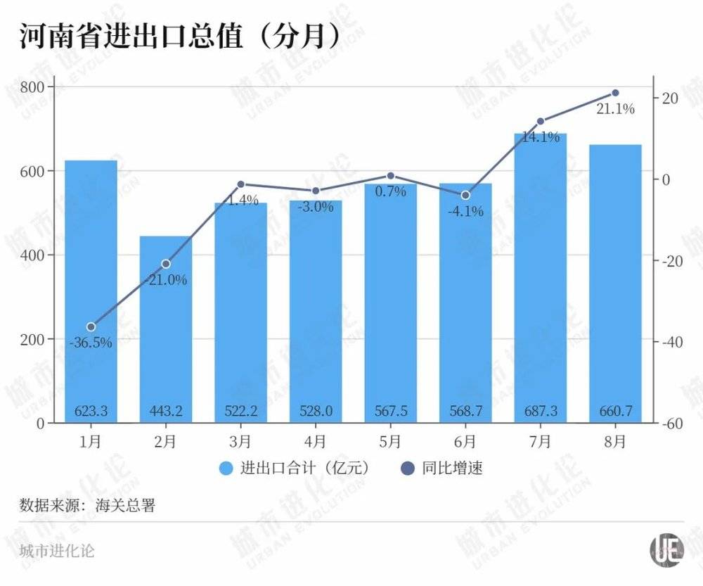 据 「河南发布」 消息,8 月份,河南省外贸进出口值同比增长 21.5%,已连续两个月保持两位数增长,进出口增速创今年以来月度新高。对于河南来说,21.5% 的月度增速实属难得。