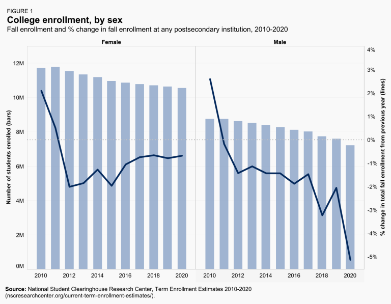 首先是在教育方面被迅速拉开距离,1979 年,美国大学入学女生只比男性多出约 20 万,而在 2021 年,这一数字飙升到了 310 万,性别比达到了史无前例的六比四。