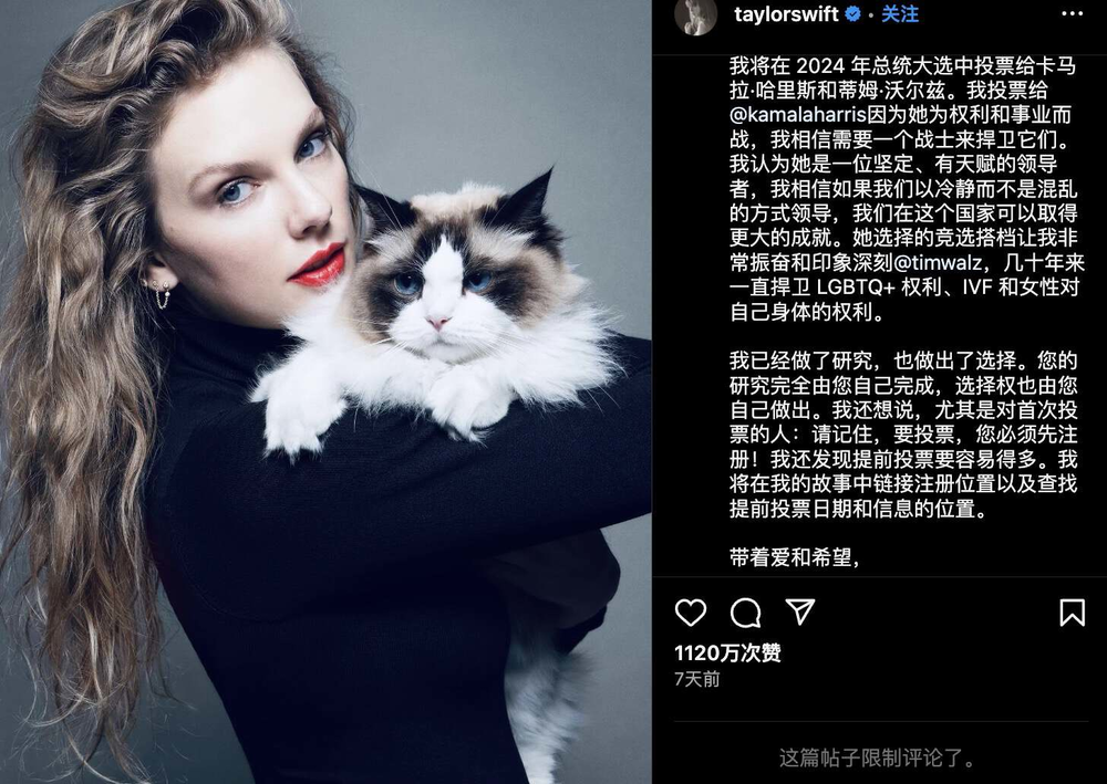 美国当下最具影响力的乡村音乐歌手 「霉霉」 泰勒·斯威夫特发布推文,公开表示将在 2024 年总统大选中投票给哈里斯。
