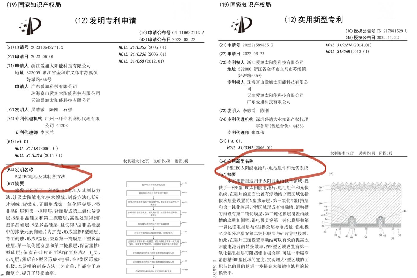在爱旭股份 2022 年申请取得的专利中,也明确可以看到名称包括 「P 型 IBC 太阳能电池片」。