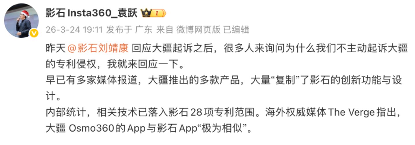 大疆起诉当天下午,影石 Insta360 创始人刘靖康微博回应:「公司仔细排查涉事的员工该时间段内申请的专利,现有证据显示均为在影石内产生的 idea 和自主创新的成果。」24 小时后,影石中国区负责人袁跃再度发声:「大疆推出的多款产品,大量 『复制』 了影石的创新功能与设计。内部统计,相关技术已落入影石 28 项专利保护范围。」