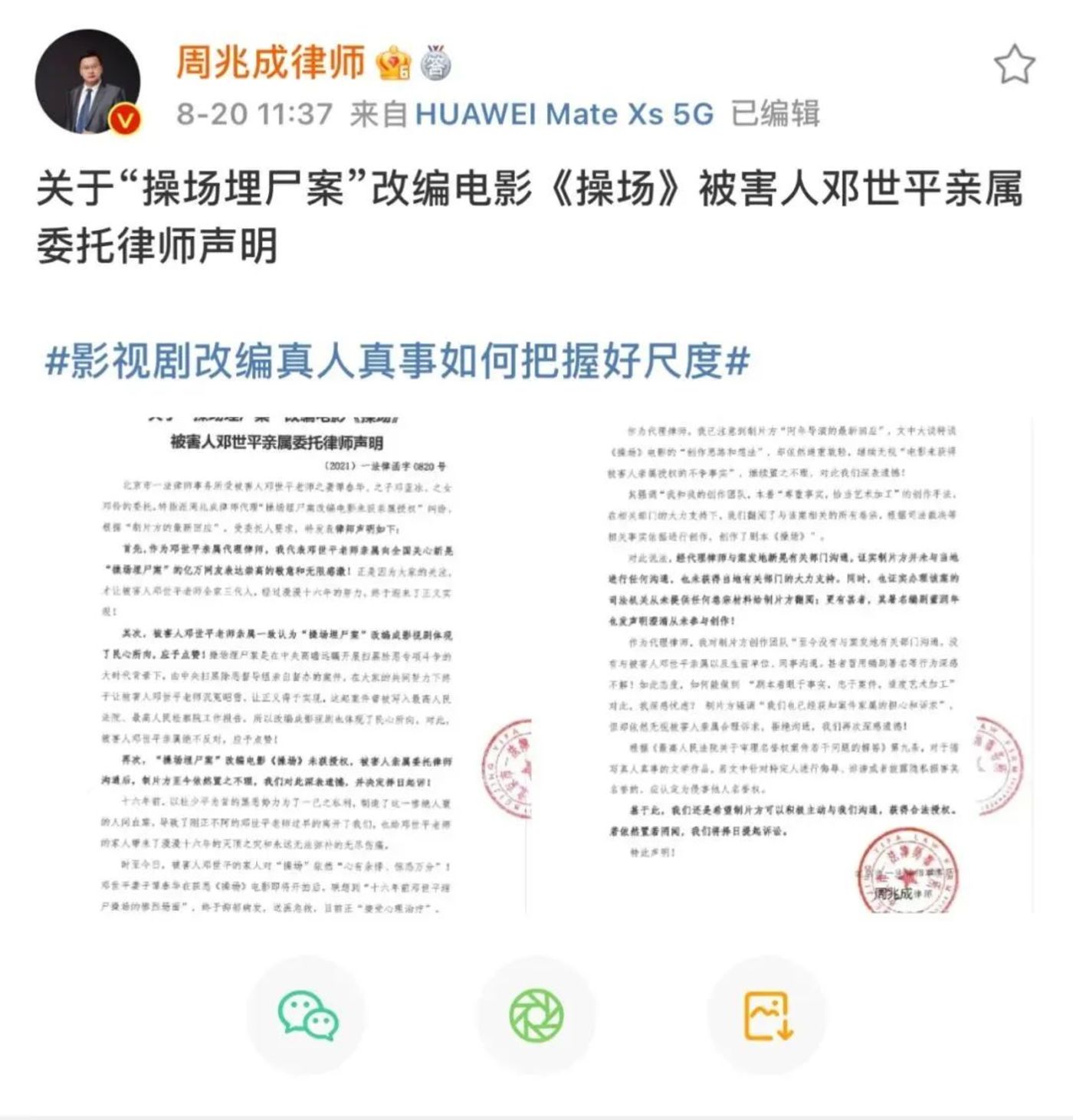 此外,真实事件改编还可能面临来自事件原型的阻力。例如,2021 年 8 月以 「操场埋尸案」 为原型的电影 《操场》 在发布选角海报后,遭到了被害者家属的反对,他们担心事实被歪曲或乱改,要求参与改编事宜的商榷。
