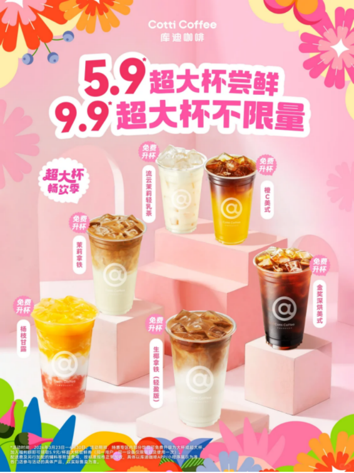 而库迪这边也坚持了自己的本色,没有预热营销,没有限量,把价格福利和时间周期给够:所有用户都可以免费解锁免费升级超大杯,持续时间是 3 月 23 日到 4 月 30 日。