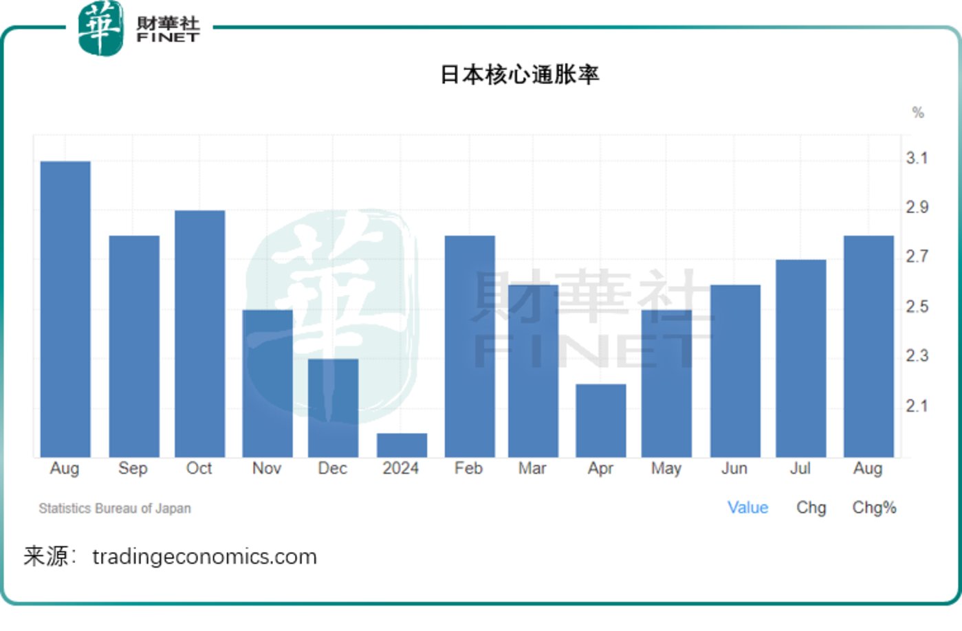 于 2024 年 8 月,扣除新鲜食品但包括能源成本在内的核心消费物价指数按年上升 2.8%,这也是 2 月以来的最高水平,高于上个月的 2.7%。