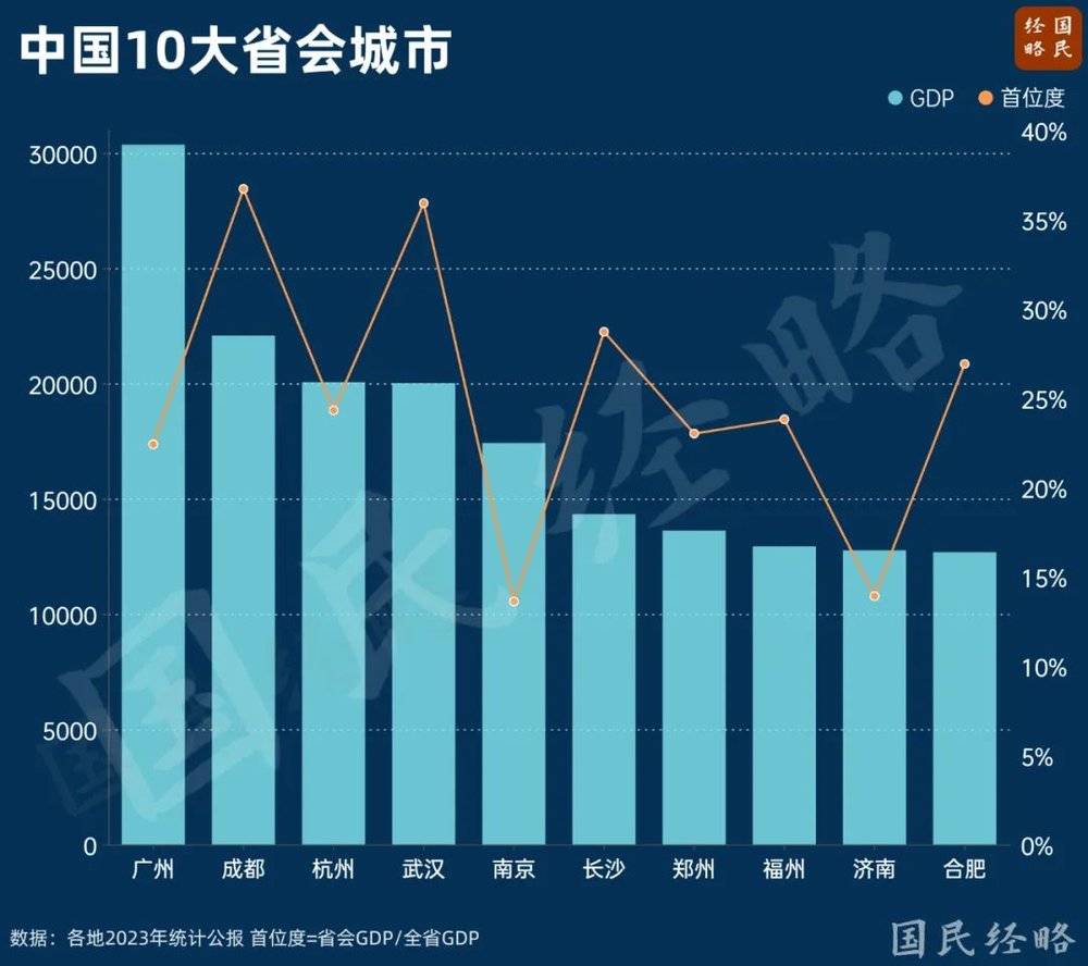 广州是 GDP 总量最高的省会城市,而南京 GDP 总量在省会城市位居第 5,但其省会 「首位度」(省会 GDP/全省 GDP)却位居倒数第一。