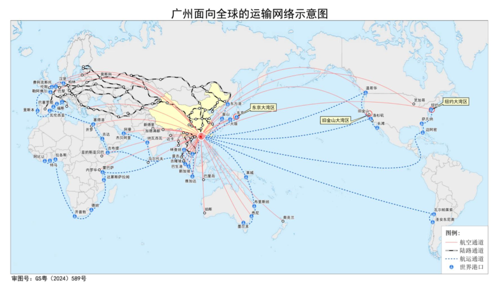 这其中,「我国重要的中心城市」 指向的是 「国家中心城市」,「彰显海洋特色」 体现的是广州国际航运中心的功能,而 「国际性综合交通枢纽」 则是 「海陆空铁」 为一体的交通区位优势。