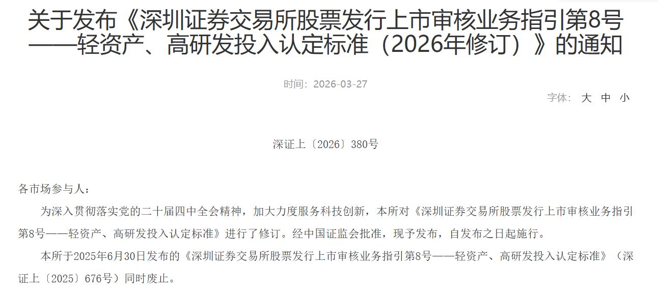 与此同时,深交所今日在官网发布了新修订的 《深圳证券交易所股票发行上市审核业务指引第 8 号——轻资产、高研发投入认定标准》(以下简称 《8 号指引》)。
