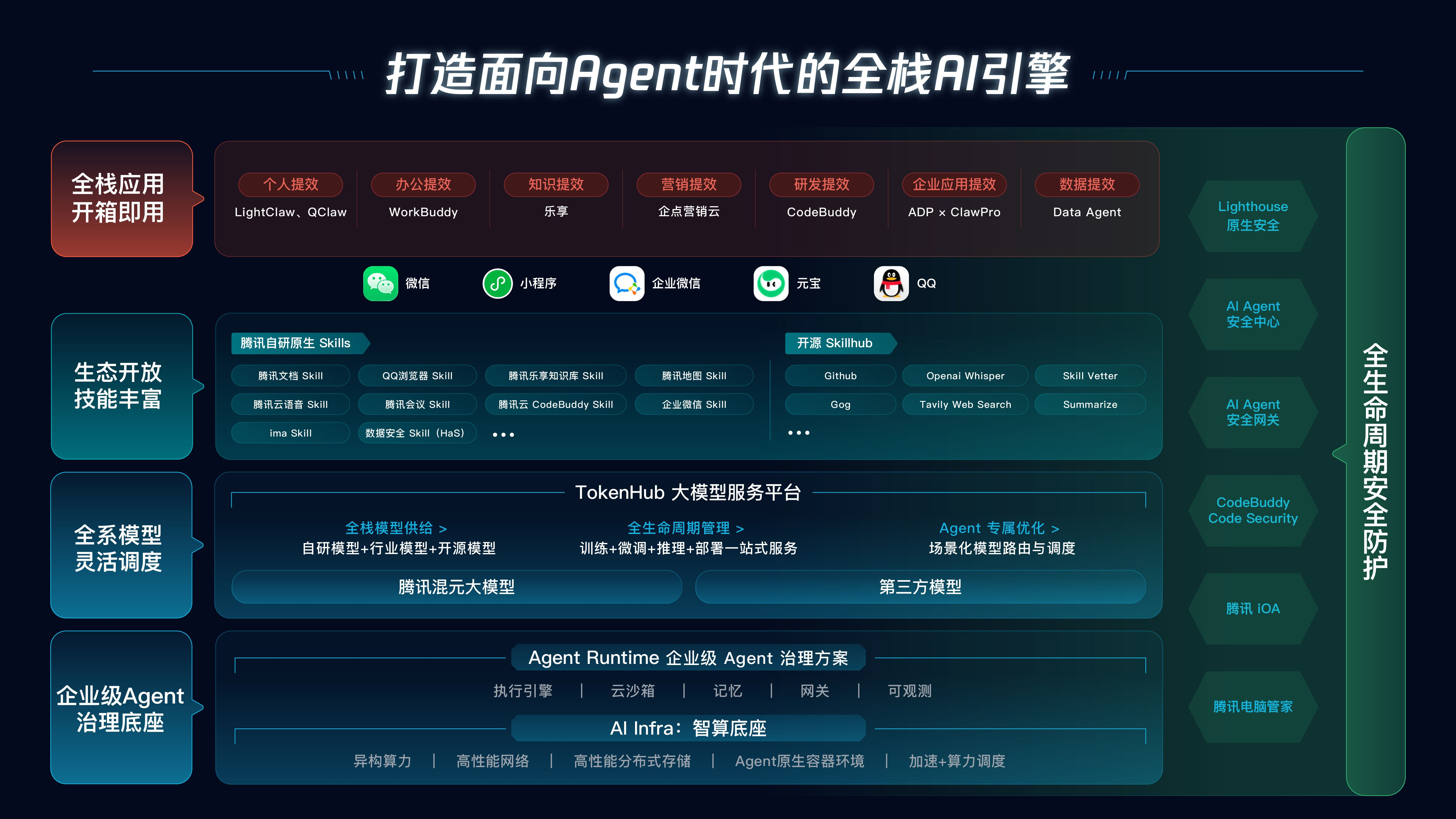 国民级产品生态的加持。腾讯最大的底气在于其无可比拟的社交和办公生态。通过打通微信、QQ、企业微信等 IM 渠道,以及将腾讯文档、腾讯会议等封装成 Skills,腾讯让 AI 具备了最顺滑的触达路径和执行环境。