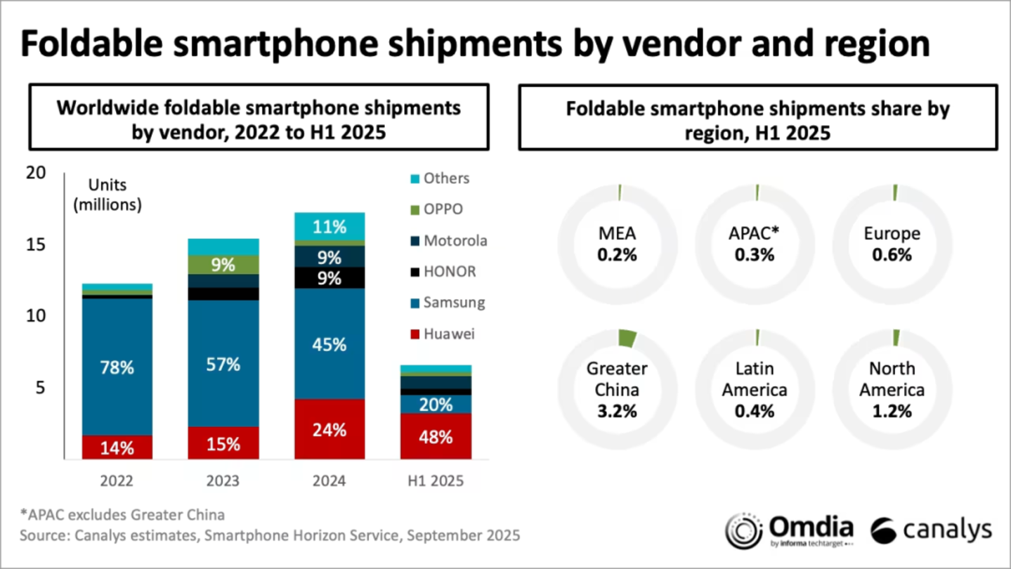 Canalys 报告显示,2025 年上半年全球折叠屏手机整体出货量仅为 660 万台,与去年同期基本持平,增长趋于平缓。