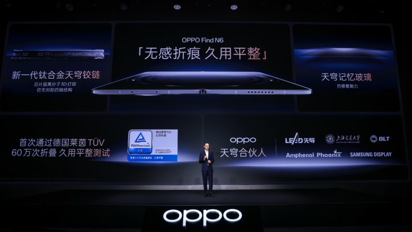 相比之下,OPPO 的技术主张要 「领先半目」,在 Find N6 新品发布会上,OPPO 牵头成立 「天穹合伙人」 联盟,引入德国莱茵 TÜV 折叠测试作为背书。