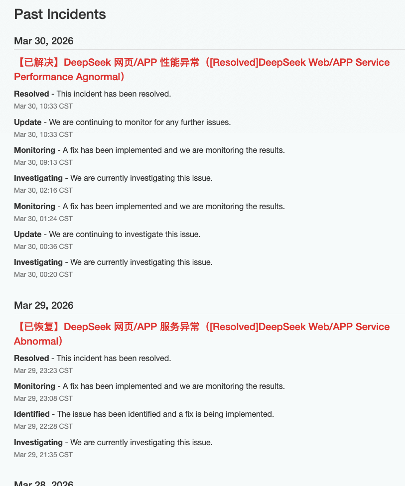【TechWeb】3 月 30 日消息,DeepSeek 官方服务状态显示,目前 DeepSeek 网页、App 性能异常问题已经解决。