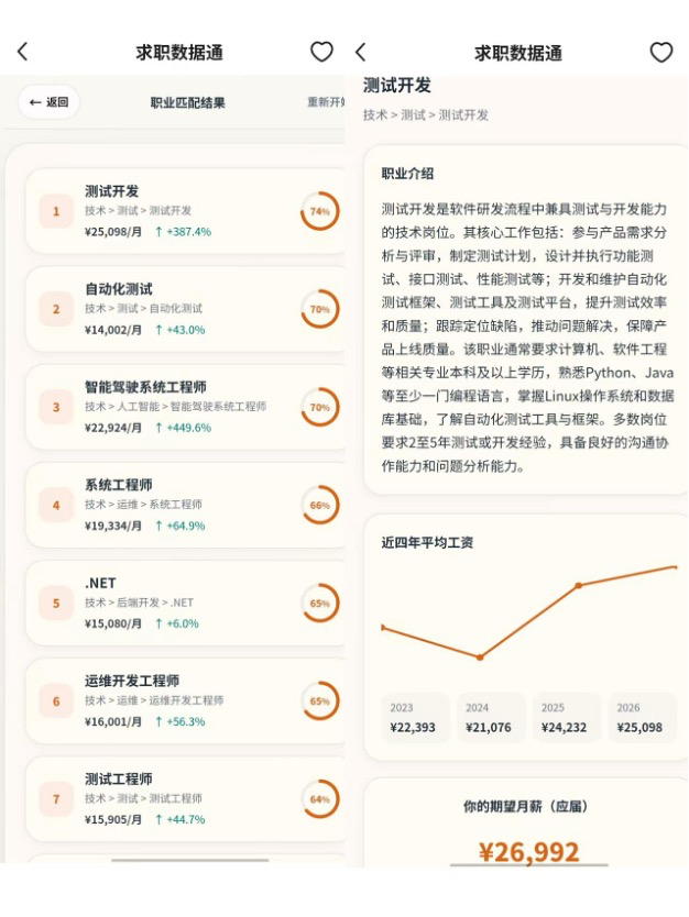 据介绍,「求职数据通」 定位于科学职业规划工具,核心解决毕业生 「选什么」 与 「怎么到达」 两大难题。