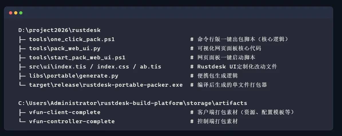 工具实现了从命令行到网页可视化面板的迭代,编译流程自动化,仅需输入核心参数即可快速生成定制化 exe 文件;项目结构清晰,依赖环境明确,编译耗时约 4 分钟,仅支持 Windows 版本的 Rustdesk 控制端/客户端编译。