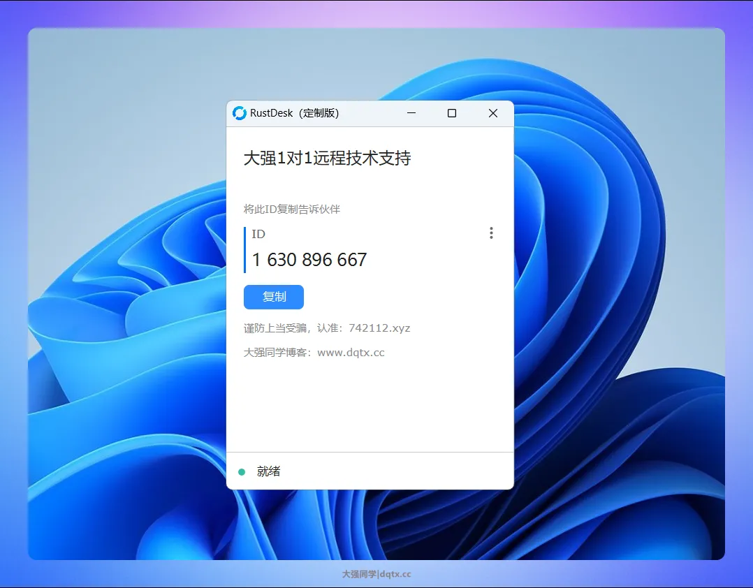 目前该工具仅支持 Windows 版本的 Rustdesk 控制端/客户端编译,若有定制编译需求,可添加微信 dqtx33 交流。