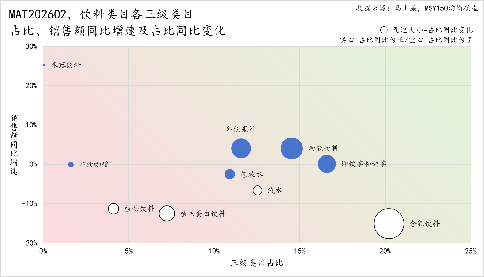 • 含乳饮料、植物蛋白饮料、植物饮料、汽水:出现了较显著的占比 (空心,占比同比为负)、销售额同比双降局面,其销售额同比下滑均超过 10% 的同时,占比也有着相当程度的下滑。其中,含乳饮料的占比下滑显著,依然与此前的风波带来的高基数有一定的关系,其自身的高糖、是否营养质疑也一直存在,依然处于下滑通道当中;植物蛋白饮料中包含杏仁露、核桃露等产品,也是受到了部分健康消费潮流带来的影响,消费者们开始检视这些产品是否如产品名称与概念宣称一样健康;相比来说,植物饮料内部则有一定的分歧,一方面,凉茶、酸梅汤等传统植物饮料类目,有缓慢下滑的趋势,另一方面,中式养生水等则在成长,但其规模还较小;汽水虽然整体类目较为传统,但其中果汁/果味气泡水等产品,也有着一定的健康概念融合与产品形态推新。