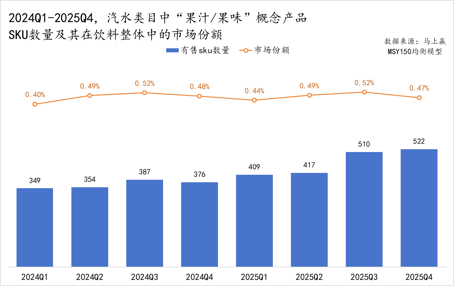 再来看汽水类目中包含“ 果汁/果味” 关键词的产品,果汁果味汽水的有售 SKU 表现明显更加亮眼,在 2024Q1-2025Q4 周期内由 349 个增至 522 个,产品供给密度大幅提升,尤其在 2025Q3、Q4,有售 SKU 数量突破 500 大关。在市场份额方面,果味果汁汽水在饮料大类中的占比始终稳定在 0.40%-0.52% 区间,并呈现一定的季节性,在 2024Q2、Q3 以及 2025Q2、Q3 的饮料旺季份额一度来到 0.5% 左右。