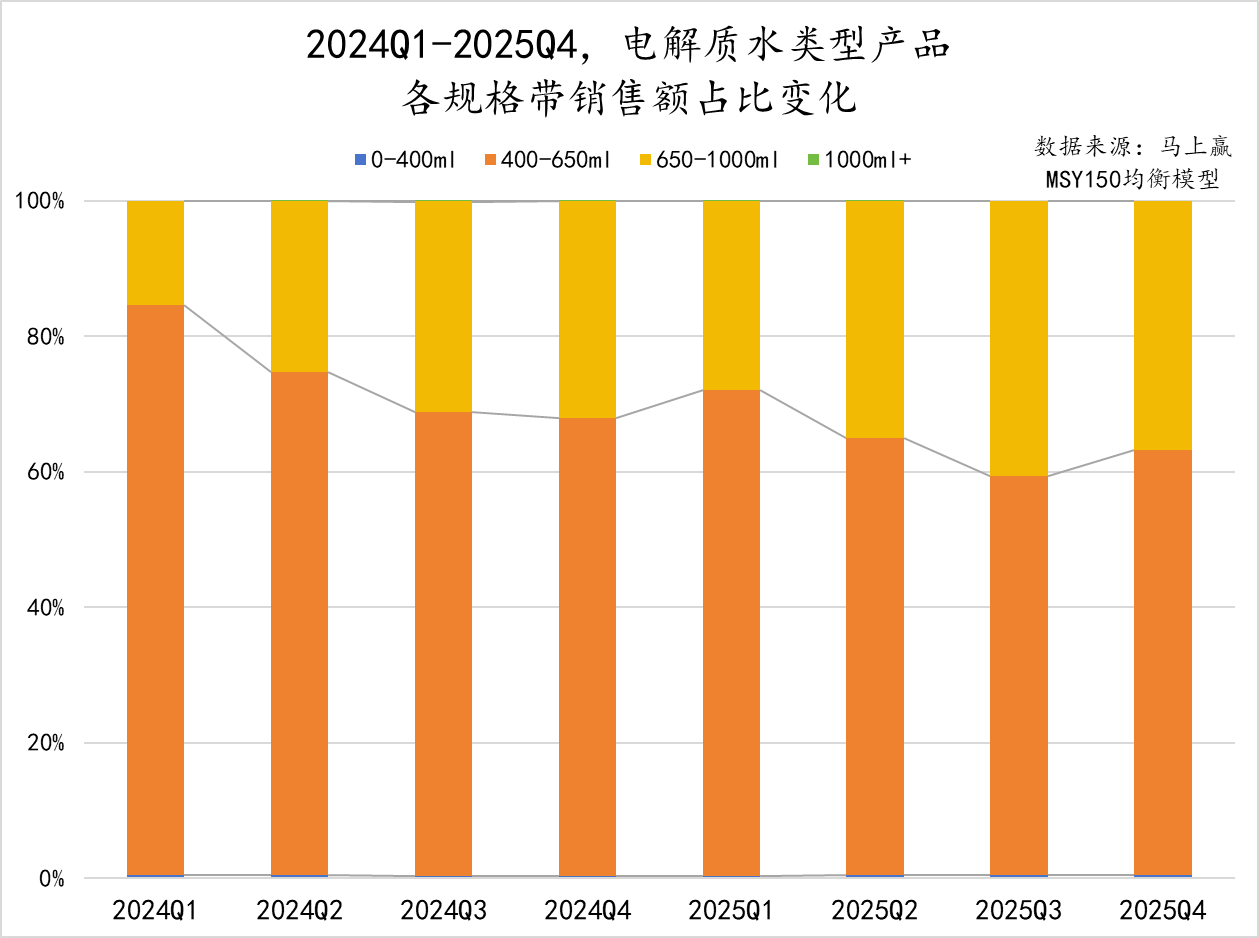 2024Q1-2025Q4,电解质水的规格分布呈现出高度集中的特征,400-650ml 及 650-1000ml 两大规格占据绝大多数市场份额。虽然整体看来,650-1000ml 规格在周期内占比增长明显,由 2024Q1 的 20% 不到增长至 2025Q3 的 40% 左右;但 400-650ml 的单人即饮规格依然是市场中的绝对主流,占比始终超过 60%。