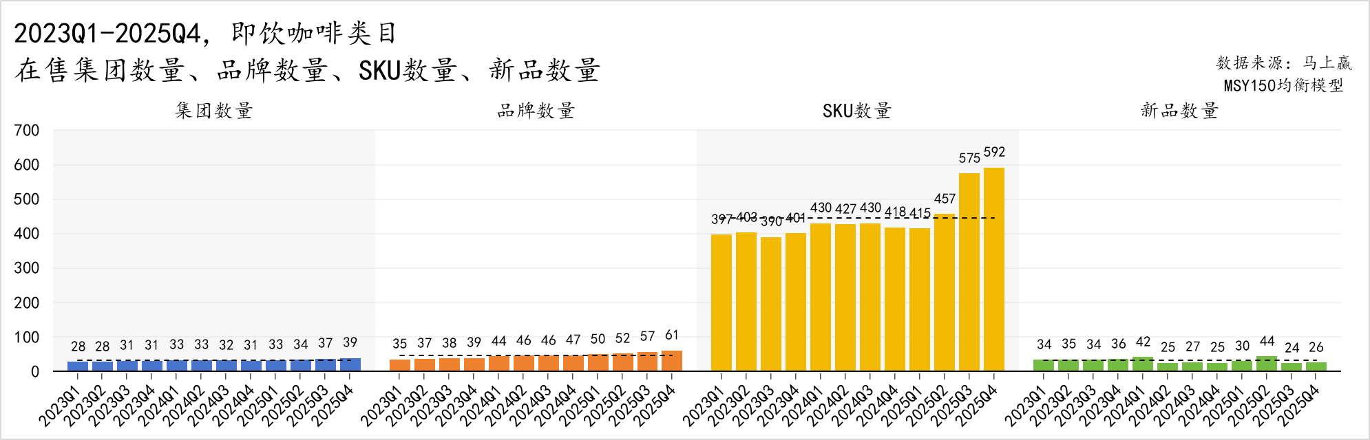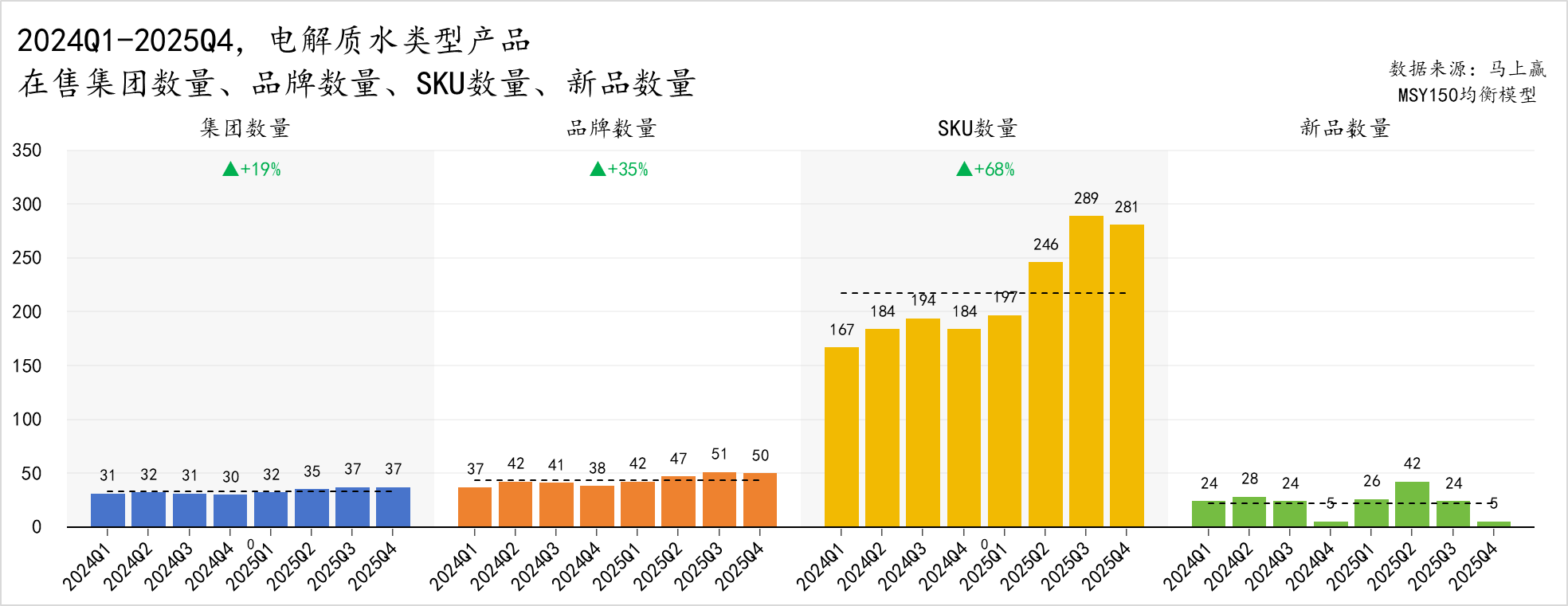 2024Q1-2025Q4,可以看到已经有不少新玩家正在积极入场:在售集团数量从 2024Q1 的 31 家增至 2025Q4 的 37 家,增幅达 19%;品牌数量同步增长,由 37 个增至 50 个,增幅达 35%;SKU 数量的增幅更加明显,由周期初的 167 个一路飙升至 2025Q3 的峰值 289 个,整体增幅达到 68%;周期内新品也层出不穷,除 2024Q4 及 2025Q4 两个季度外,季度新品数量平均 28 个,2025Q2 季度一度达到 42 个之多。