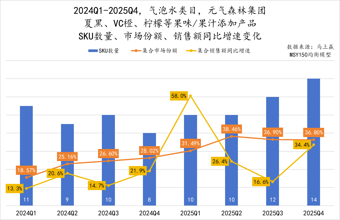 2024Q1-2025Q4,元气森林旗下夏黑、VC 橙、柠檬等果味 / 果汁添加气泡水产品的 SKU 数量由初期的 11 个增长至 14 个,产品矩阵、规格不断丰富;集合在气泡水类目中的市场份额从 2024Q1 的 18.57% 一路攀升至 2025Q4 的 36.80%,实现翻倍增长;集合销售额同比增速虽然受限于季节、促销等原因,波动较大,但也实现了全周期正增长,峰值的 2025Q1,集合销售额同比增速超过 50%,对于一个成熟、规模已经较大的产品类型来说,50% 的销售额同比增速相当之高,消费者需求提升的带动非常显著。