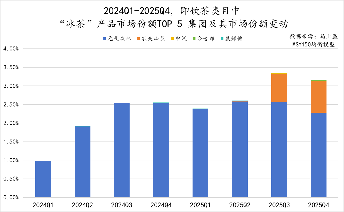 观察冰茶内部的集团市场格局,2024Q1-2025Q4,元气森林始终占据主导地位。农夫山泉在 2025 年宣布加入冰茶队列中后,基本未影响到元气森林冰茶的市场份额,为冰茶概念带来了新的“ 增量”,与元气森林冰茶共同助力冰茶市场份额超过 3%。此外,中沃、今麦郎、康师傅也纷纷入场,相关产品也都在进一步成长中。