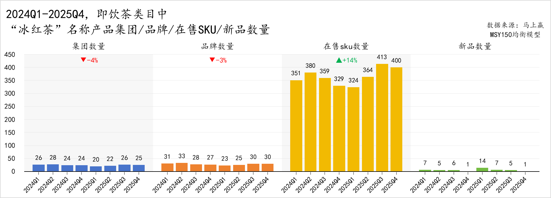 2024Q1-2025Q4,冰红茶作为传统概念饮料在集团数量与品牌数量稍有减少,分别出现 4% 和 3% 的降幅;在售 SKU 数量由 351 个增至 400 个,整体增幅 14%,新品投放季均为个位数,整体节奏平缓稳定。