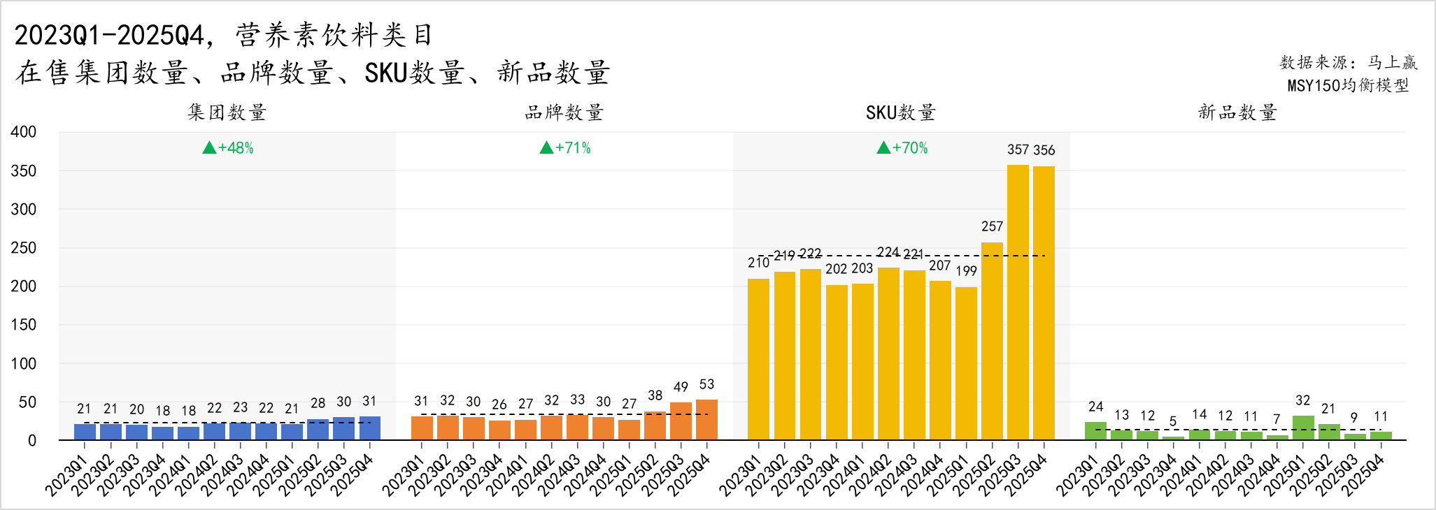 最后回到营养素饮料类目的供给侧数据,2023Q1-2025Q4,营养素饮料在供给端迎来了一波可观的增长。集团数量由 2023Q1 的 21 家增加至 2025Q4 的 31 家,整体增幅达 48%;品牌数量增长更加明显,由 31 家增长至 53 家,增幅达到了 71%。同时商品数量也迎来了同步扩容,SKU 数量从 210 个跃升至 356 个,整体增幅 70%,并在 2025Q3、Q4 迎来大幅增长;季度新品投放数量大多维持在两位数,2025Q1 达到峰值,单季度投放新品多达 32 款。