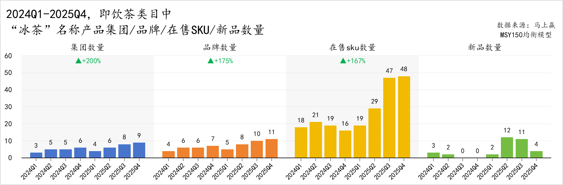 而冰茶则呈现完全不同的发展态势,参与冰茶赛道的集团数量从 3 家激增至 9 家,整体增幅 200%;品牌数量从 4 个增至 11 个,整体增幅 175%,可见有大批企业注意到并正在涌入冰茶赛道。“ 冰茶” 的商品数量同样创下新高,在售 SKU 数量从 18 个跃升至 48 个,整体增幅 167%;新品投放节奏在 2025 年显著加快,饮料旺季 Q2、Q3 分别新增新品十余款。