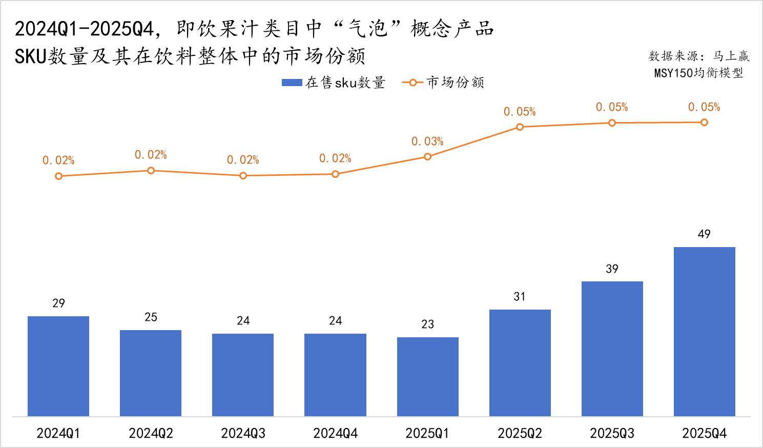 先看即饮果汁类目中的“ 气泡” 概念产品,2024Q1-2025Q4 气泡果汁的 SKU 数量虽在淡季有所回落,但整体仍呈增长趋势,由 2024Q1 的 29 个增长至 20252025Q4 的 49 个。而在市场份额方面,气泡果汁在饮料大类中的占比由周期初的 0.02% 稳步增长至周期末的 0.05%,整体增长了两倍有余。SKU 数量与市场份额的数据都在说明:气泡果汁正在逐步受到市场与消费者的认可,2026 年的销售情况依然值得期待。