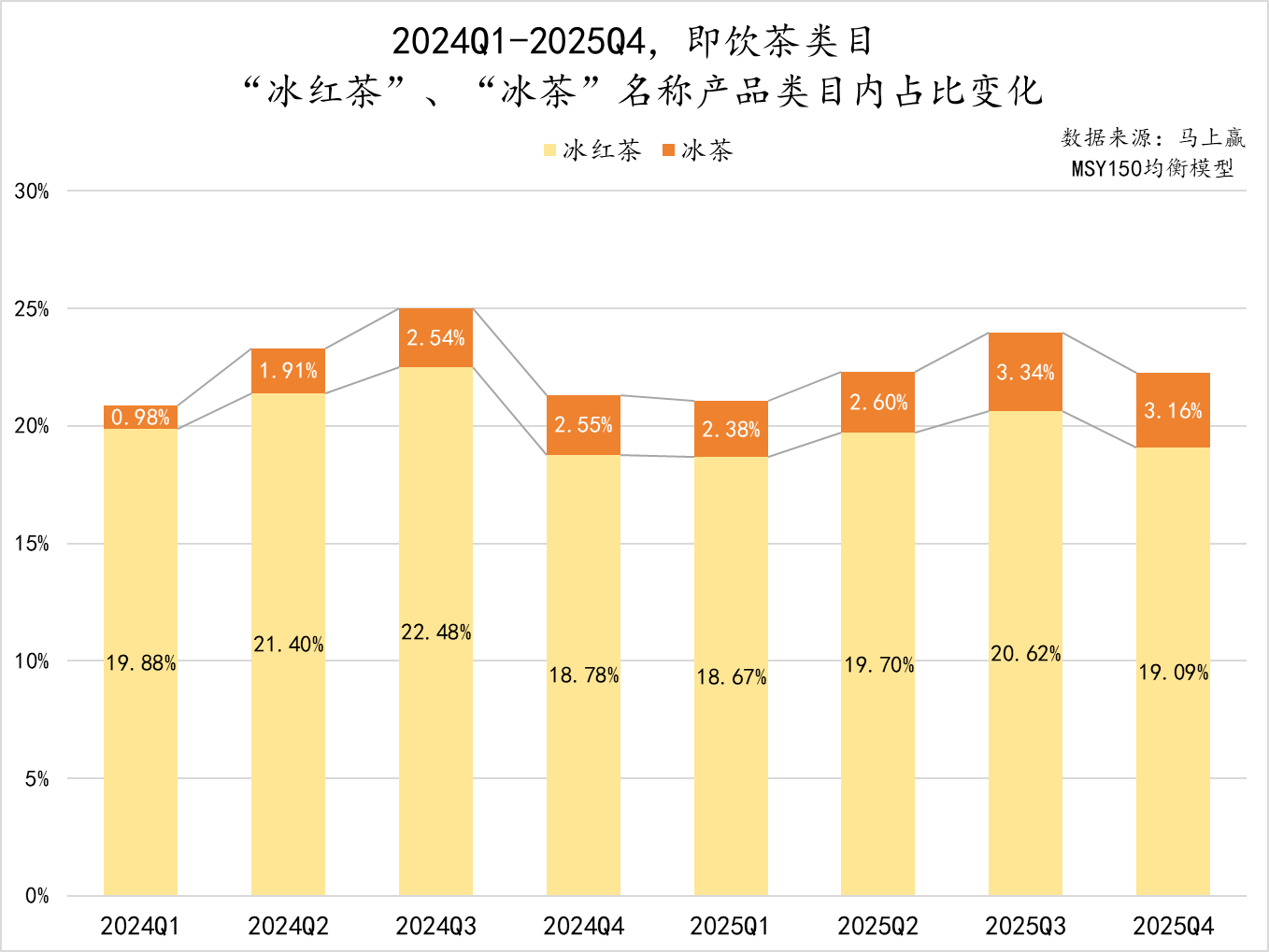 再来看市场份额占比情况,冰红茶作为传统、大众的即饮茶,在类目中占比仍在 20% 上下浮动。但相比之下,冰茶概念产品的占比则在一路上升,由 2024Q1 的不足 1%,一路飙升至 2025Q3、Q4 的超过 3%。冰茶不断迎来占比新高的同时,冰红茶在 2025 年的旺季表现却略有回落—— 由于场景、产品类型、人群的高度相似,冰茶或许已经开始挤占冰红茶的市场空间,这场围绕柠檬茶的“ 概念迭代”,或将持续进行,甚至愈演愈烈。