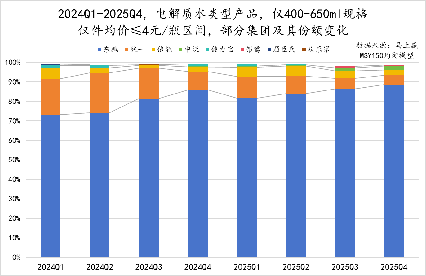在件均价≤4 元/瓶的“ 高性价比” 价格区间,东鹏占据了大部分市场份额且仍在持续攀升,从 2024Q1 的 73% 左右一路增长 2025Q4 的近 90%,增速惊人。虽然这一价格带赛道也有统一、依能等集团参与,但在该切片内,其他集团的市场份额遭到东鹏的持续挤压。